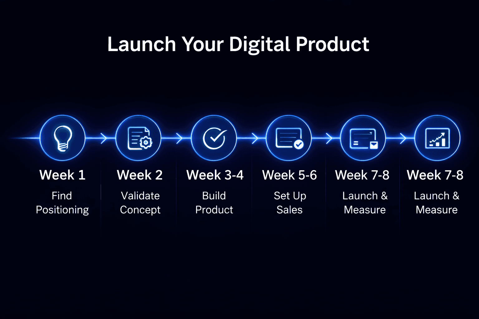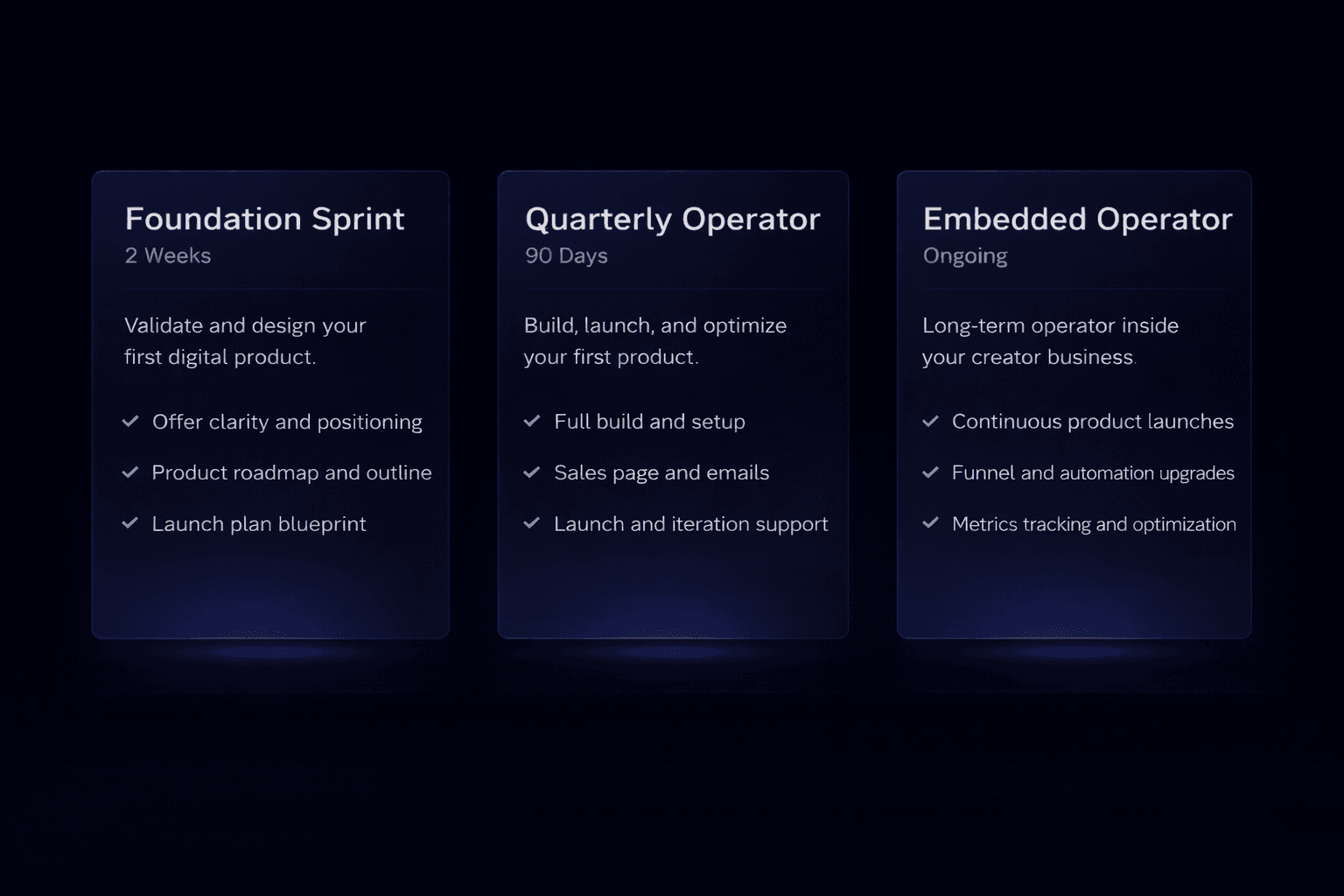 We act as your behind-the-scenes operator to plan, build, and launch your first digital product fast.